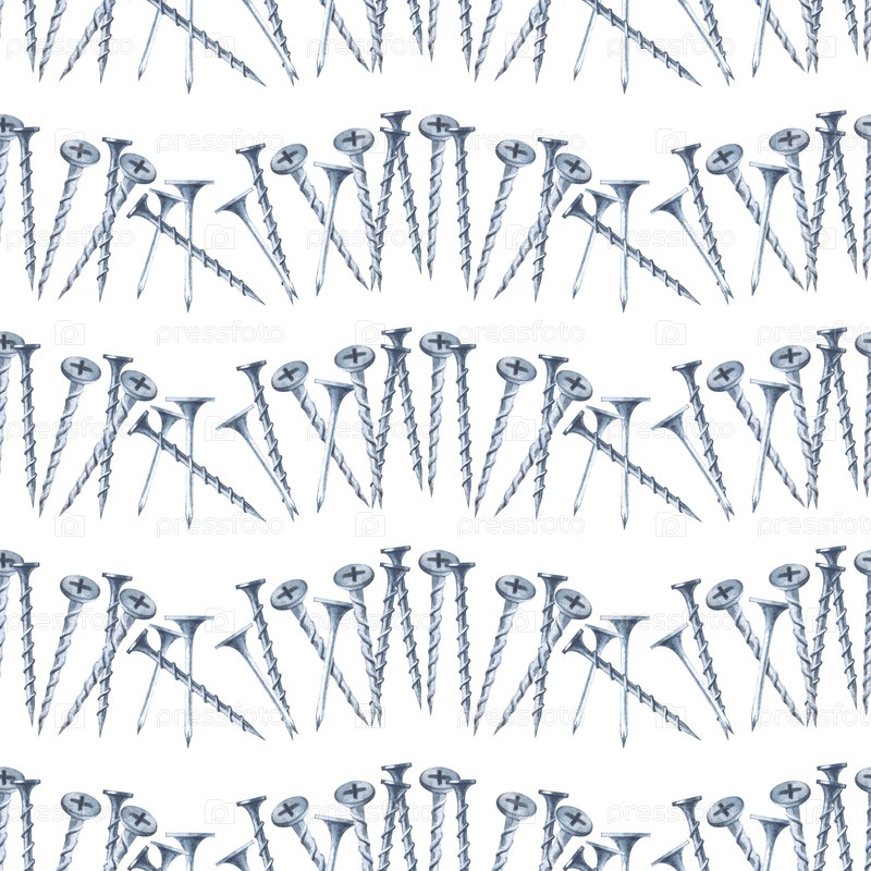 Промышленный бесшовный рисунок с рядами реалистичных серебристых металлических винтов и болтов на изолированном фоне. иллюстрация акварели идеально повторяется, что делает его идеальным для украшения магазинов оборудования, упаковки подарков со строительн
