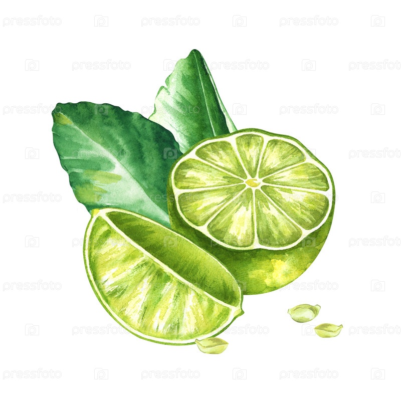Яркая ботаническая акварельная иллюстрация, в которой изображены вырубленный пополам лайм, сочный клин и свежие зеленые листья..Небольшие ситрусовые семена включены для завершения натурального состава пищи.Этот высококачественный клипарт идеально подходит