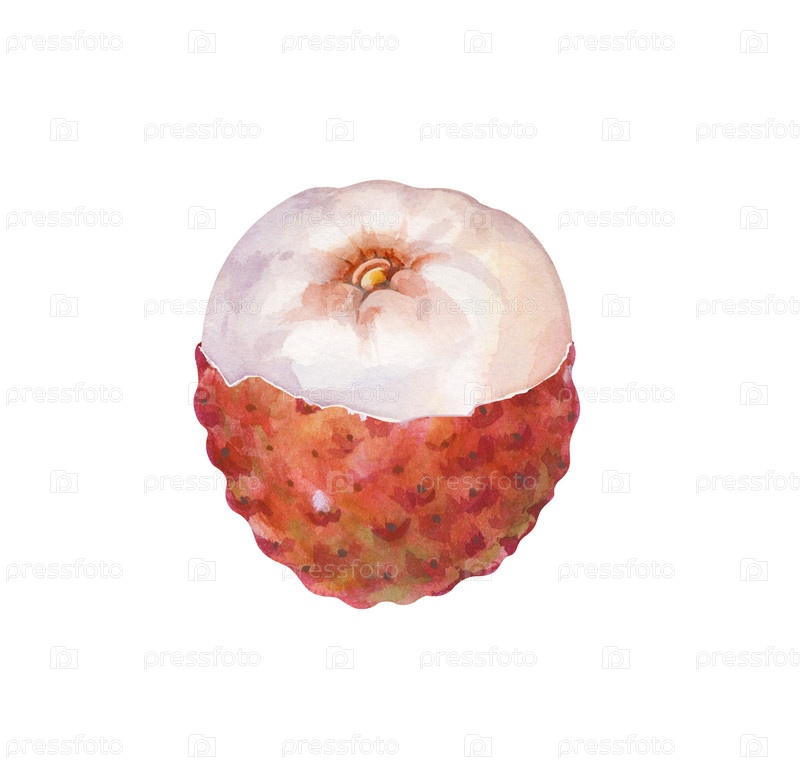 Реалистичная рисованная вручную акварельная иллюстрация фрукта личи, частично очищенного для выявления полупрозрачной белой сочной мякоти. изолированный на белом фоне