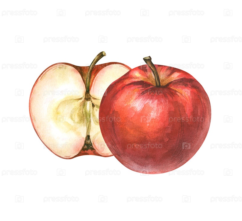 Акварельная иллюстрация с целым спелым красным яблоком и сочной половиной, показывающей ядро и семена. Изолировано на белом фоне. Идеально подходит для упаковки органических продуктов питания, брендинга продуктовых магазинов, блогов здорового образа жизни