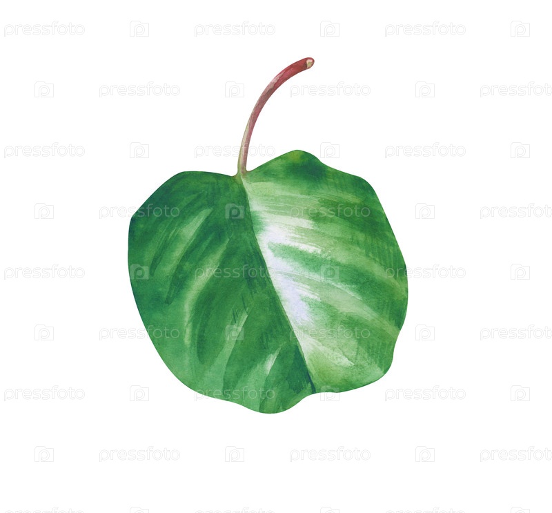 Ботаническая акварельная живопись, изображающая один зеленый лист плодового дерева. Лист темно-зеленый с маленьким розовым стеблечкой на изолированном фоне. Реалистичный клипарт для упаковки органических продуктов, косметики, этикетки чая, а также для исп