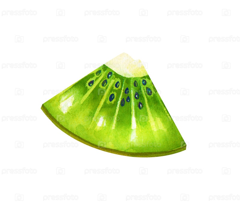 Иллюстрация акварель показывает кусочек свежего киви с семенами. Изолирован на белом фоне. Реалистичный клипарт для брендинга здоровой пищи, меню баров смузи, упаковки органических продуктов питания и ботанические рисунки летом