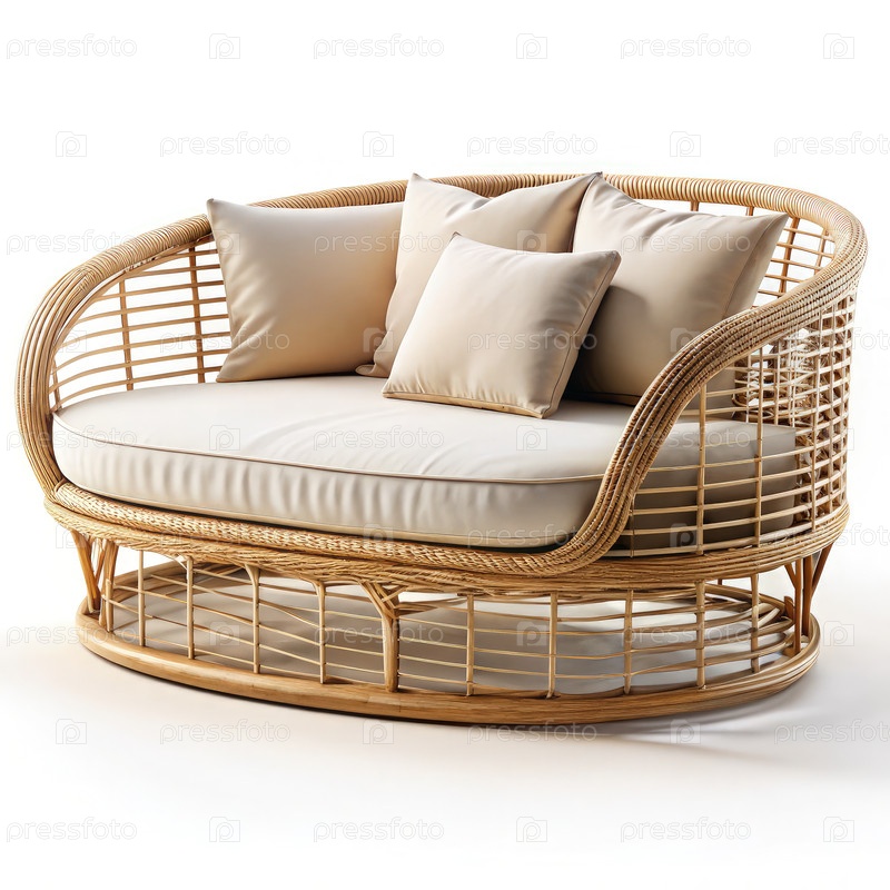 Удобная ротанновая кроватка с подушками на простом белом фоне