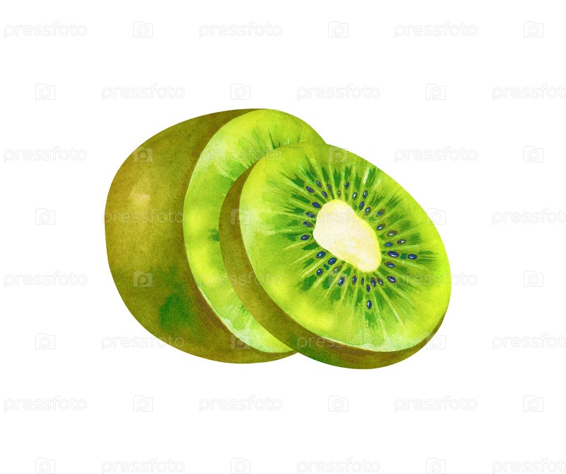 Ручная акварельная иллюстрация, изображающая половину фрукта киви с прилегающим к нему свежим круглым кусочком. Выделено на белом фоне. Идеально подходит для упаковки органических продуктов питания, этикеток соков, блогов здорового образа жизни и ботаниче