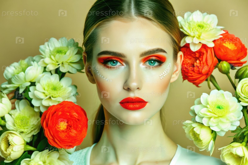 Красивая женщина, окруженная яркими цветами в потрясающей футуристической обстановке