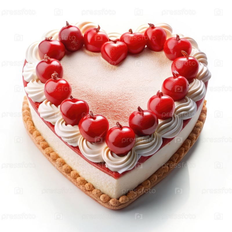 Вкусный торт в форме сердца, украшенный вишней на белом фоне