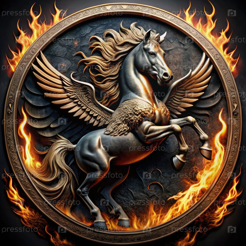 Логотип современной рок-группы с Пегасом, динамическими пламенами и сложными деталями