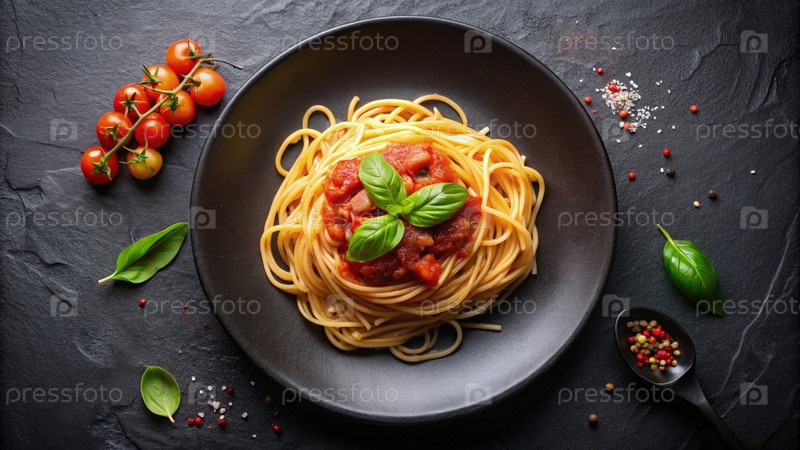 На темной тарелке представлена обильная порция итальянских спагетти, покрытых крепким томатным соусом