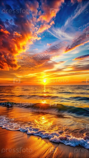 Красивый закат над спокойным морем с мягкими волнами, движущимися к берегу