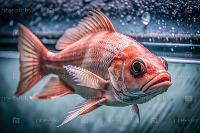 Детали яркой красной рыбки, грациозно плавающей в чистой аквариумной обстановке