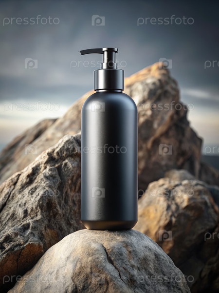 Гладкая черная бутылка шампуня на каменистой поверхности в естественной обстановке
