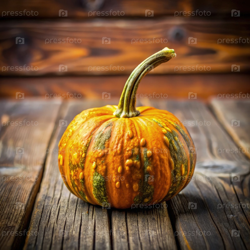 Тыква, опирающаяся на деревянную поверхность с естественной текстурой и цветовыми вариациями