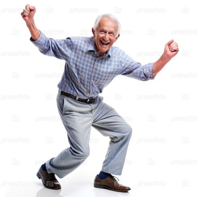 Счастливый пожилой мужчина, танцующий с радостью в динамической позе на белом фоне