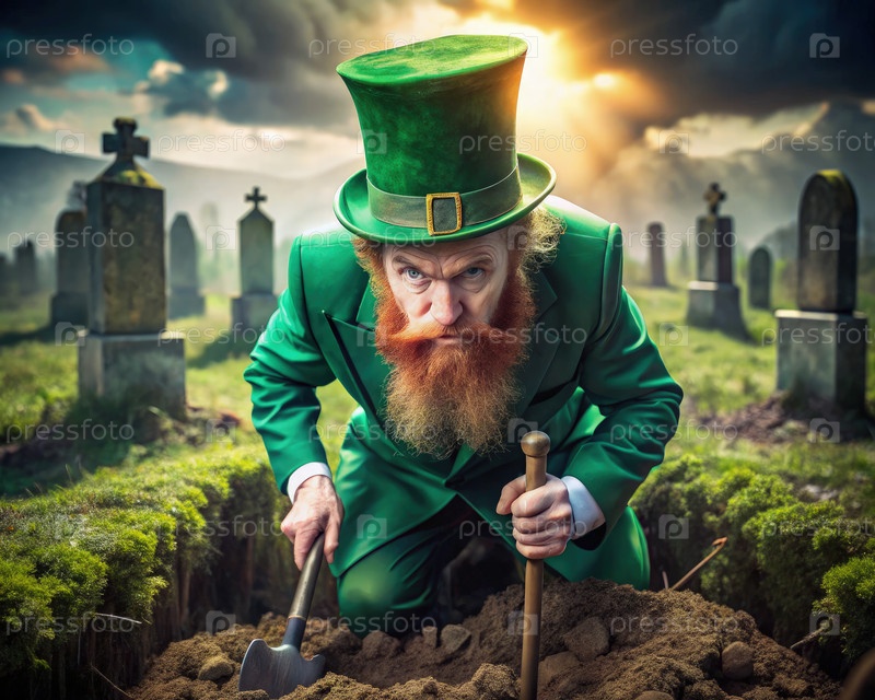 Лепрекван копает могилу на кладбище при закате солнца с надгробными камнями