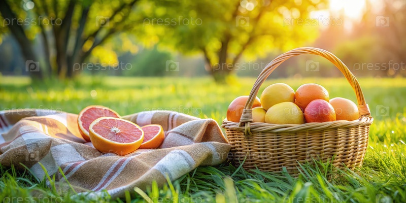 Корзина с свежим грейпфрутом на одеяле в зеленом солнечном пейзаже
