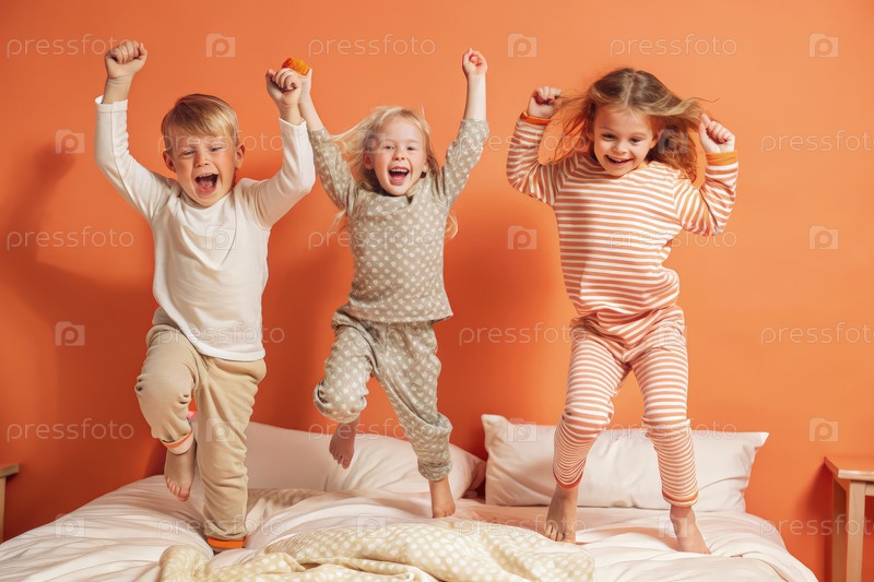 Веселые дети прыгают на удобной кровати в течение игривого дня