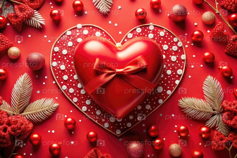 Подарочная коробка с красным сердцем, окруженная праздничными украшениями для празднования Дня святого Валентина