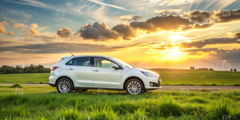 Белая машина, припаркованная на травянистом поле во время захода солнца с облаками в небе