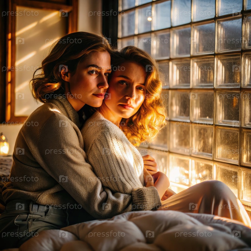 Две женщины обнимаются под мягким светом у окна во время уютного момента в помещении