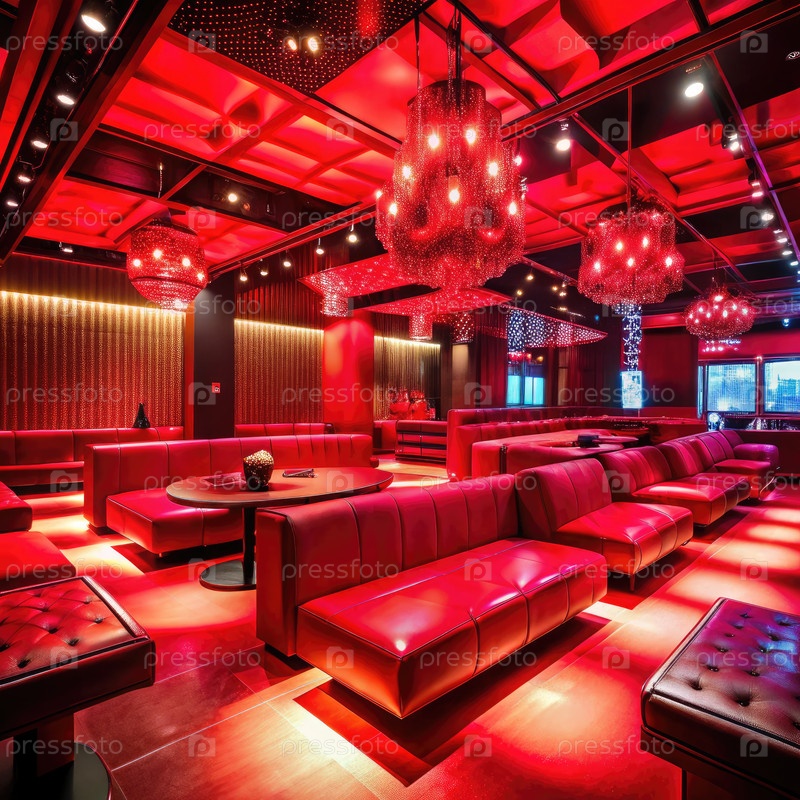 Живая красная комната для вечеринок с салонными местами и драматическим освещением в клубе