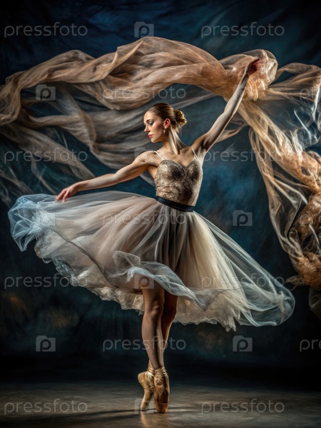 Грациозная балерина крутится в пушистом туту на драматическом фоне