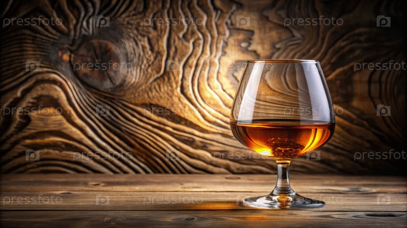 Стакан коньяка на деревянном столе с текстурированным фоном в теплых тонах