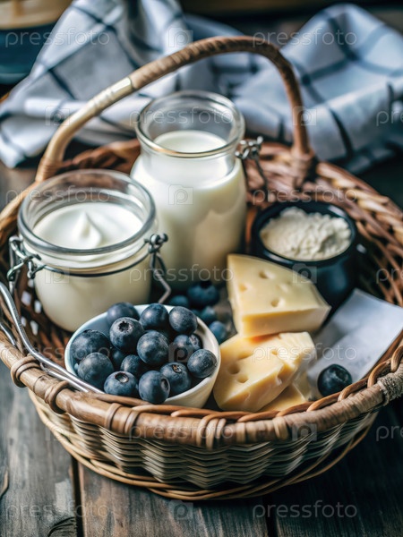 Свежий йогурт и корзина молока с чернилами и сыром на деревянном столе