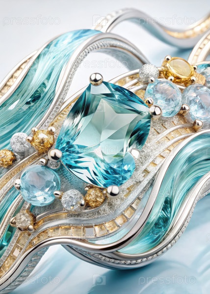 Потрясающий дизайн ювелирных украшений из аквамарина с текущими волнами и мерцающими драгоценными камнями. генеративный ИИ