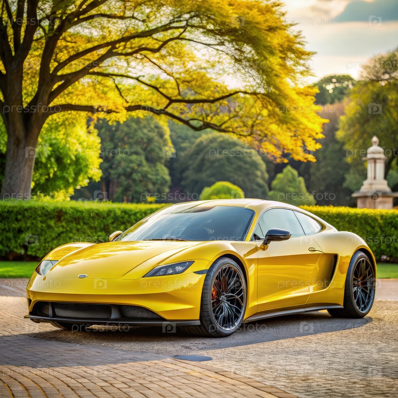 Желтый спортивный автомобиль, припаркованный в стильном месте, окруженном зеленью