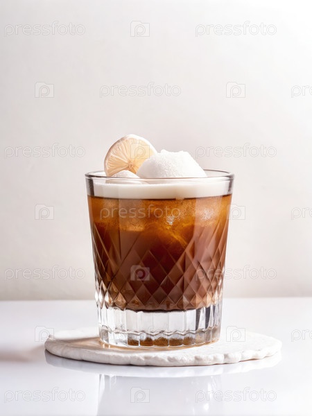 Коричневый коктейль в кристаллическом стакане со срезкой лимона на белом фоне