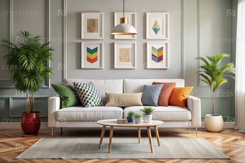 Современный скандинавский дизайн гостиной с яркими элементами декора