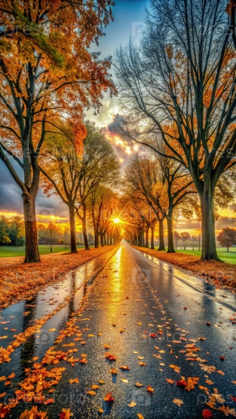 Пустая асфальтированная дорога, облицованная деревьями во время осеннего заката на окраине города
