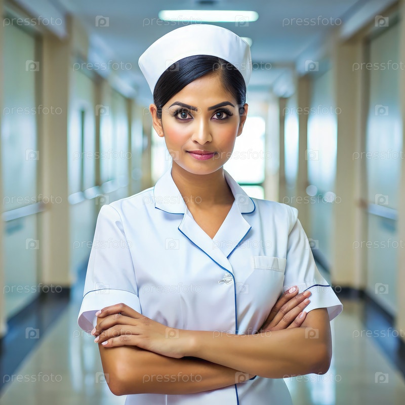 Индийская медсестра в форме уверенно стоит на коридоре больницы