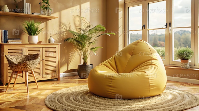 Уютный стул с желтой сумкой для бобов в скандинавском уголке Бохо с естественным светом