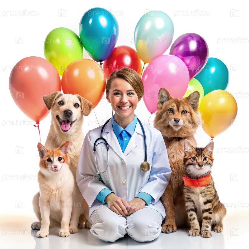 Празднование Дня ветеринарного работника с счастливыми домашними животными и красочными воздушными шарами