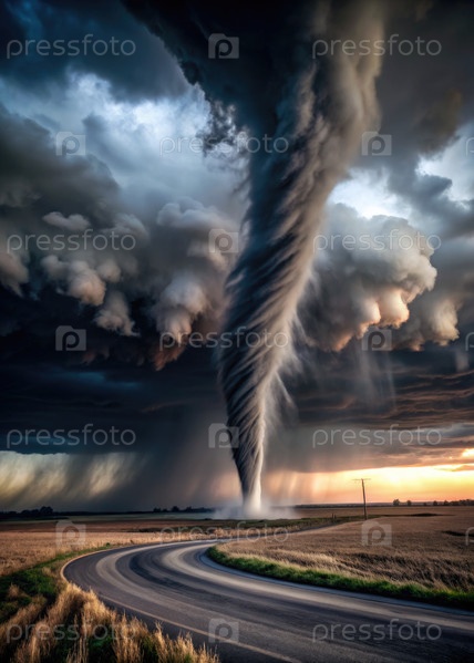 Мощный торнадо формируется над открытыми сельскохозяйственными угодьями на закате солнца в драматическом небе