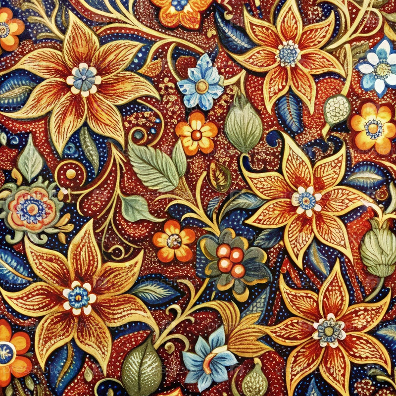 Живая батиковая ткань со сложными цветочными узорами в теплых тонах