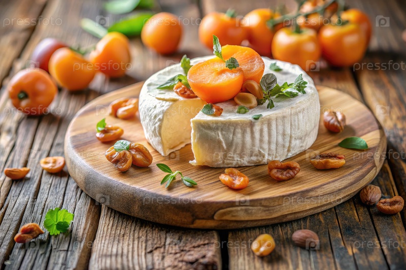 Мягкий сыр, украшенный сухими абрикосами и орехами на деревянной доске