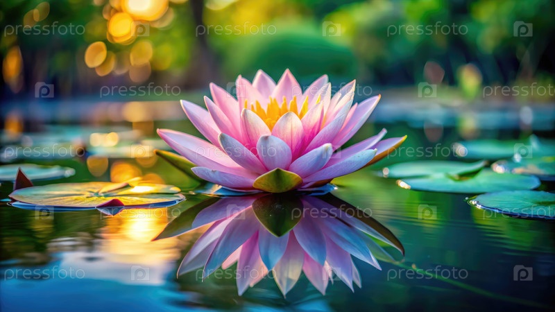 Красивый цветок лотоса, расцветающий на тихом пруду в часы захода солнца