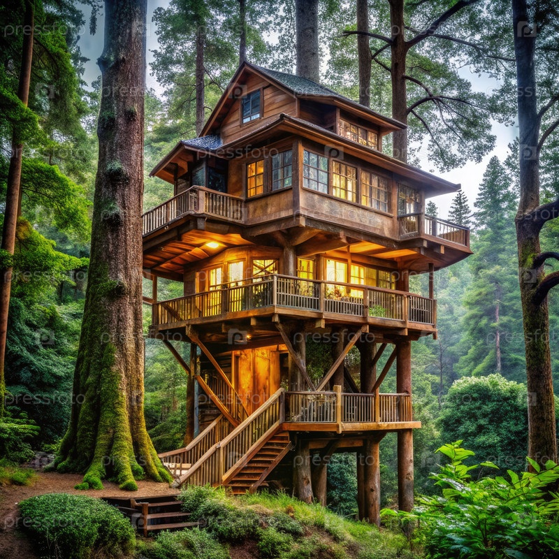 Очаровательный домик на дереве среди высоких деревьев в пышном лесу при закате