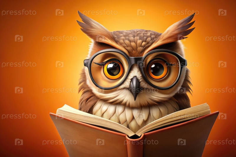 Сова в очках любит читать книгу на ярко-оранжевом фоне
