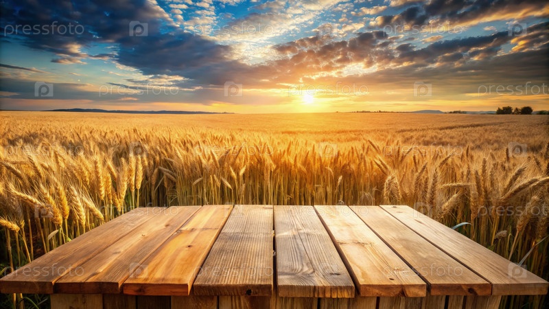 Естественный деревянный стол с видом на золотое пшеничное поле во время заката