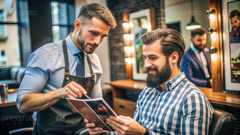 Барбер показывает клиенту варианты прически из каталога во время сессии ухода за собой