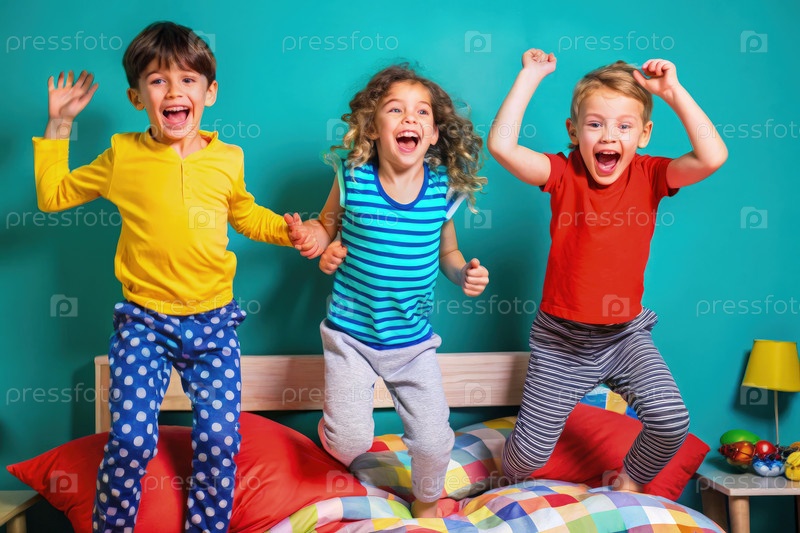 Веселые дети прыгают на удобную кровать в красочной спальне во время игривого утра