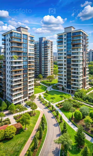 Потрясающий вид на современный жилой комплекс с благоустроенными пешеходными зонами