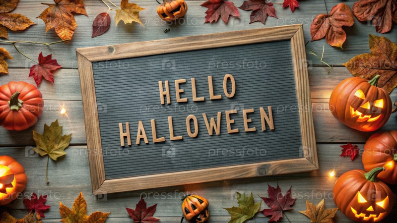 Ужасный привет Хэллоуина с резными тыквами и осенними листьями на выставке