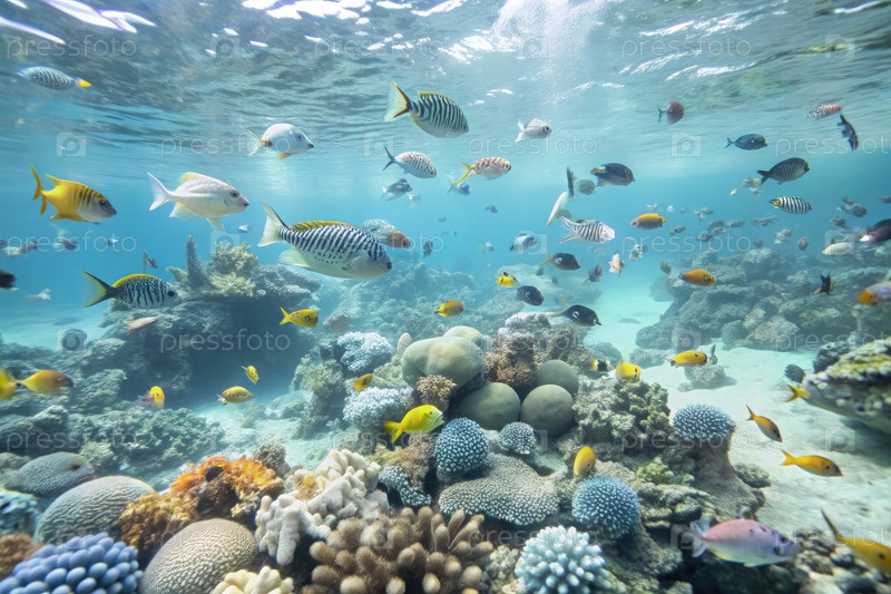 Вибрирующий подводный коралловый риф, изобилующий разнообразными видами рыб в чистых водах