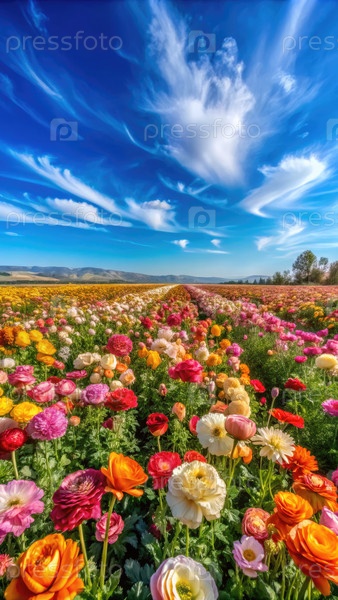 Красочное поле, наполненное розовыми цветами под чистым голубым небом в солнечный день