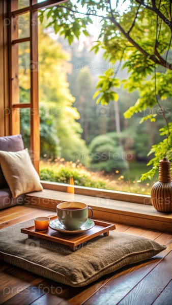 Уютный уголок с теплым чашечкой чая, в окружении спокойной природы днем