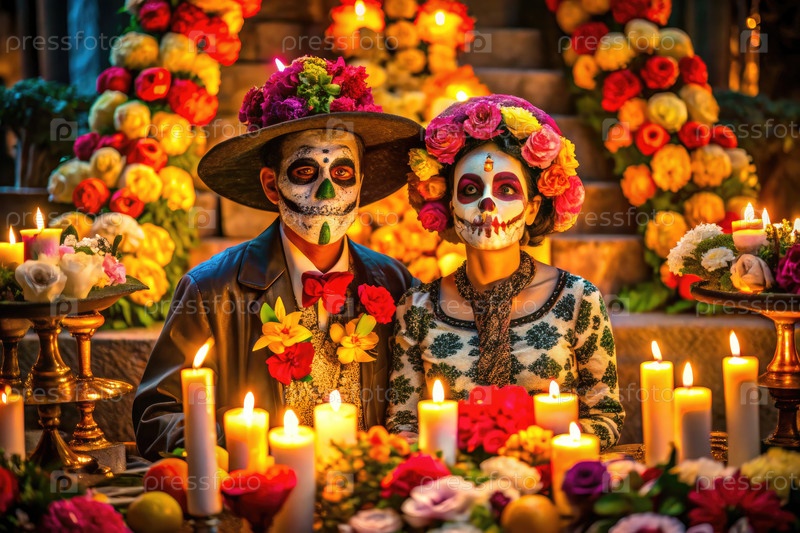 Празднование Дня мертвых с алтарем и традиционным костюмом в Мексике